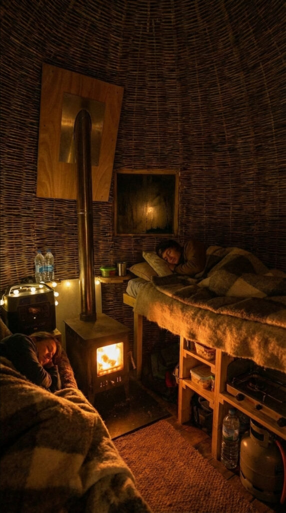 Inside the cabin, two compact elevated sleeping platforms are positioned along opposite sides of the interior to maximize space while allowing easy movement through the central area. The beds are insulated with thermal blankets and natural wool coverings that help maintain body heat and improve sleeping comfort in off-grid conditions.
