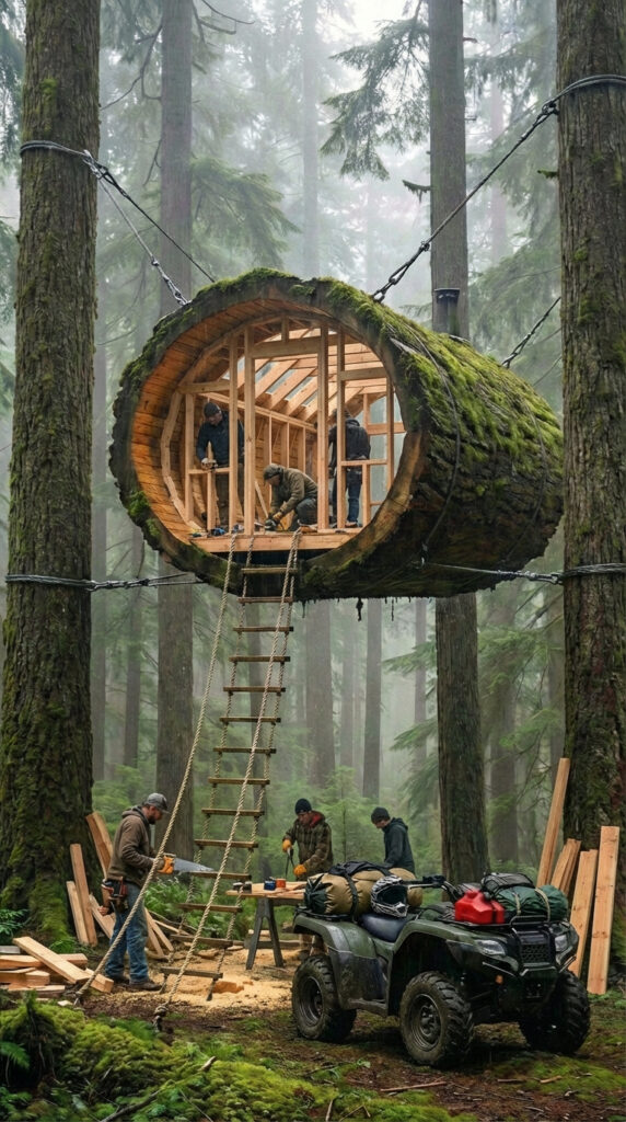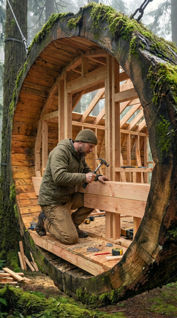The construction begins by reinforcing the interior of the log with a custom wooden frame carefully shaped to follow the natural curvature of the trunk. Builders install structural beams and supports that create stability without removing the organic character of the wood. Suspension cables anchored to nearby trees distribute weight evenly, allowing the cabin to remain secure while minimizing impact on the ground below.