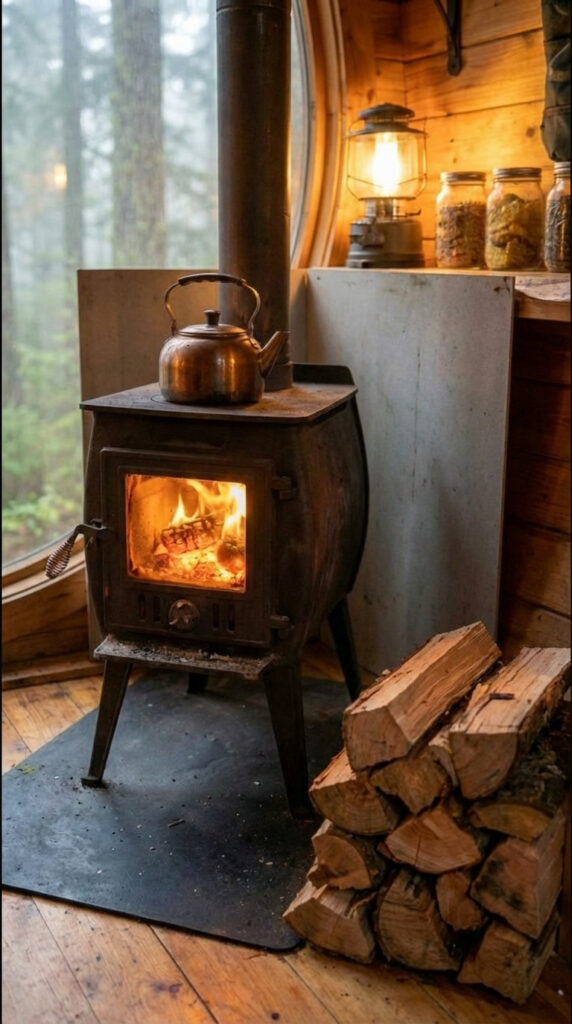 At the heart of the cabin stands a traditional wood-burning stove, providing reliable heat and becoming the visual centerpiece of the space. The soft glow of the fire reflects off the wooden interior, creating a calm and inviting environment even during cold or rainy days in the forest. A neatly stacked supply of firewood sits beside the stove, ensuring continuous warmth and reinforcing the cabin’s practical, self-reliant design philosophy.