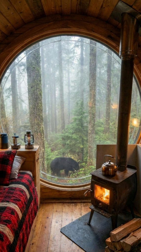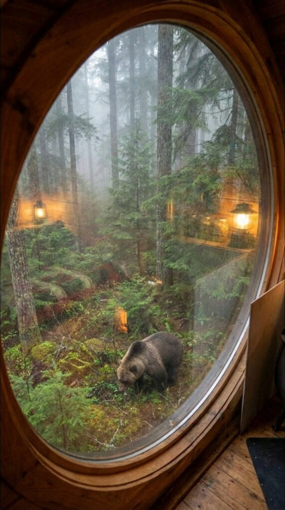 The centerpiece of the cabin is a large panoramic circular window that transforms the entire space into a natural observation point. From inside, the forest becomes part of the interior experience — morning fog drifting between trees, changing light throughout the day, and wildlife quietly moving through the landscape. The window allows residents to safely observe animals such as deer, foxes, or bears without disturbing their natural behavior, turning ordinary moments into unforgettable encounters with nature.