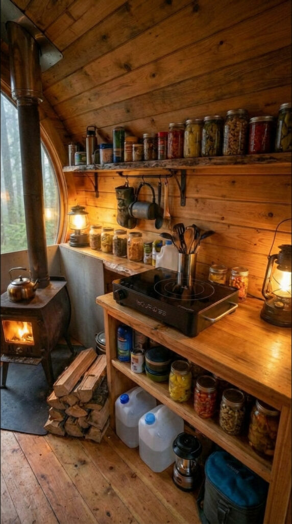 Next to the stove, a compact kitchen area is carefully arranged to maximize efficiency without sacrificing comfort. A solid wooden countertop supports a portable cooktop, allowing simple meal preparation while maintaining flexibility in the small interior layout. Open shelving keeps essential tools and cookware within easy reach, while glass jars filled with preserved vegetables, grains, and dry foods showcase thoughtful long-term storage. Every item is visible, organized, and ready for daily use.