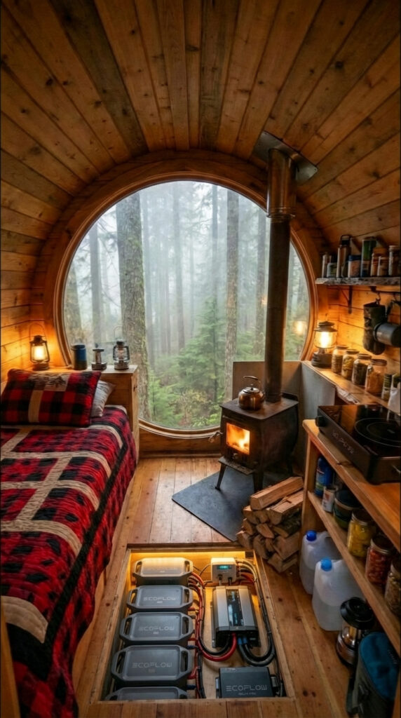 One of the most impressive features of this suspended log cabin is its independent power system, allowing comfortable living deep in the forest without any connection to traditional electrical infrastructure. The entire energy setup is carefully hidden beneath the floor, preserving the warm and cozy interior while turning the cabin into a fully functional off-grid living space.