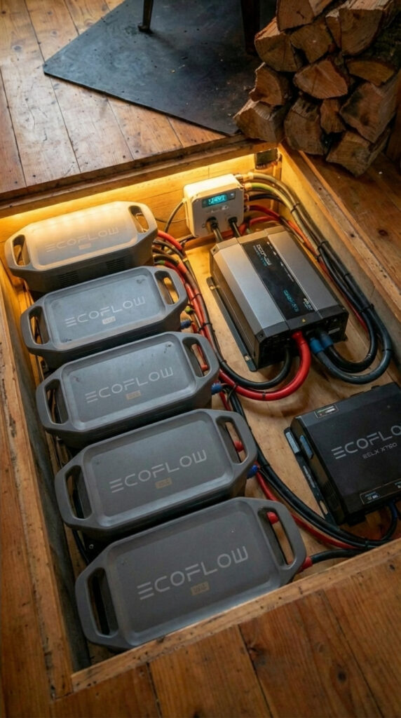 At the core of the system are multiple EcoFlow battery units connected into a unified energy network. Together they work as a compact residential power station, storing electricity and delivering stable energy throughout the cabin. This setup supports lighting, cooking equipment, charging devices, ventilation, and everyday essentials while maintaining consistent performance.
