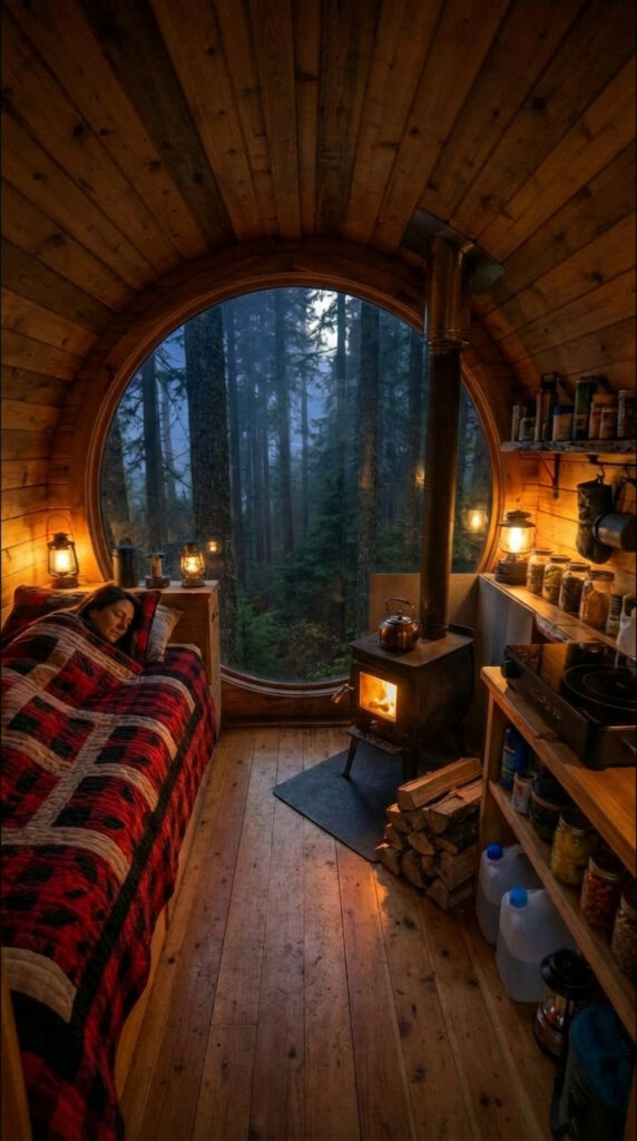 Together, the stove, kitchen, and organized food supplies create a living environment that feels complete despite its compact size. The space is not only designed for survival, but for everyday comfort — cooking, resting, observing nature, and enjoying quiet moments surrounded by the forest.