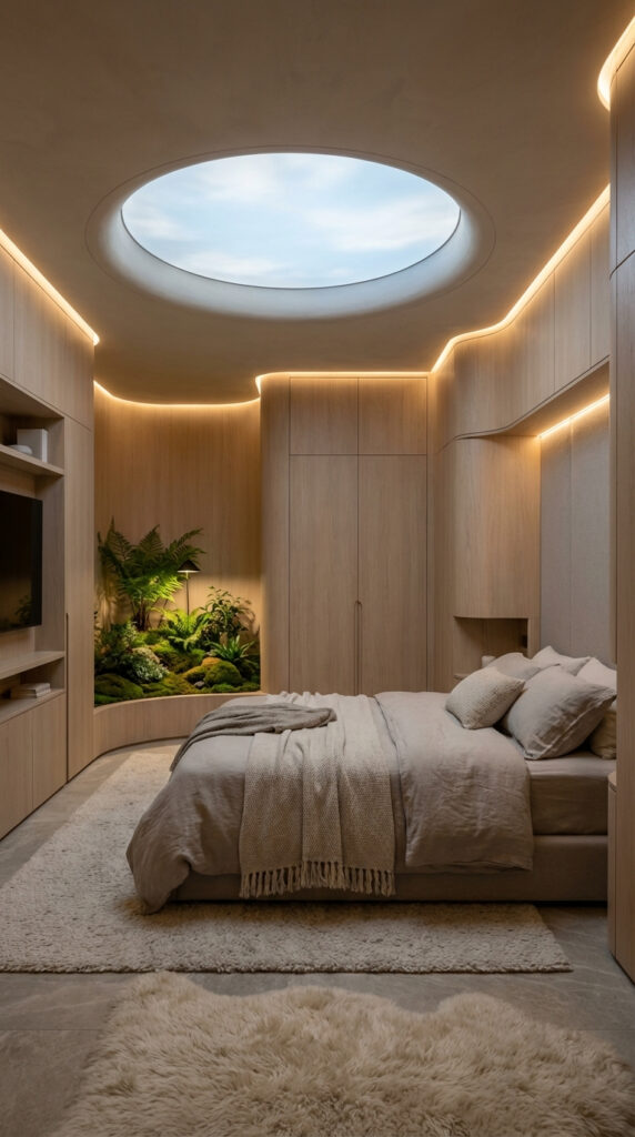 The private bedroom continues this philosophy of comfort and calm living. Soft natural tones, integrated storage, and indirect ceiling lighting create a quiet sleeping environment. A circular skylight-style ceiling feature simulates natural daylight, helping maintain a healthy daily rhythm even without direct outdoor exposure.