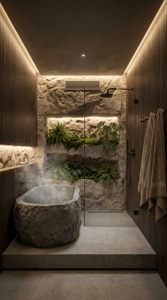 A handcrafted stone bathtub becomes the centerpiece of the room, offering a deep soaking experience that helps restore comfort after long days. The natural rock textures contrast beautifully with clean architectural lines and minimalist fixtures, balancing rugged durability with modern design.