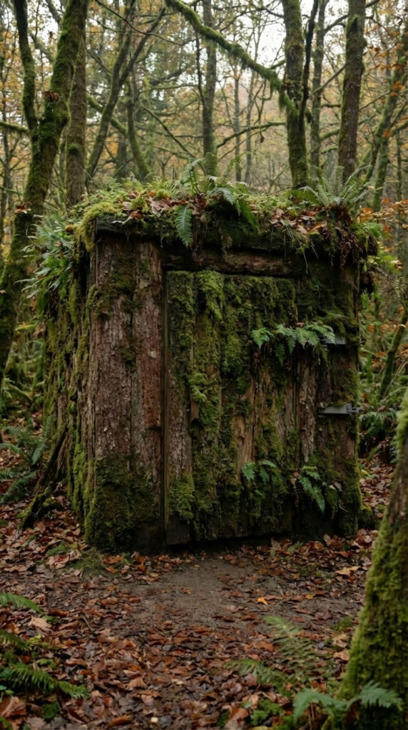 Deep in the forest, this cleverly concealed bunker blends almost perfectly with its surroundings, appearing from the outside as nothing more than an old moss-covered tree stump. Covered with bark textures, natural greenery, and living plants, the structure visually disappears into the landscape, making it nearly indistinguishable from the forest itself. The entrance remains subtle and discreet, preserving the natural look while quietly hiding a carefully designed living space inside.