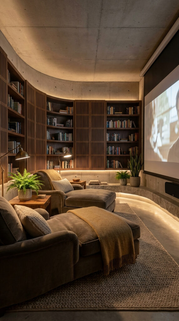 Soft seating, reclining chairs, and warm textile elements create a cozy atmosphere ideal for reading, watching movies, or simply resting after a long day. Built-in wooden shelving filled with books adds both practical storage and a sense of familiarity, transforming the room into a quiet retreat where occupants can relax for extended periods of time.