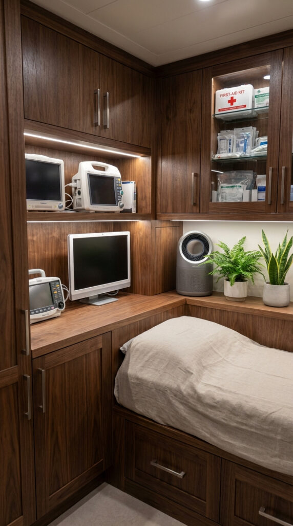 Physical and medical readiness are also key parts of the design. A dedicated fitness room includes strength training equipment for maintaining health and mobility, while a fully equipped medical station provides space for monitoring health, storing supplies, and handling emergencies when external access may be limited.