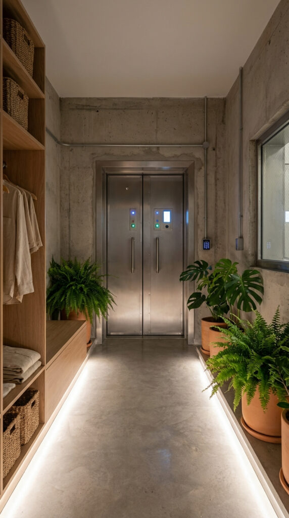 The entrance corridor demonstrates how modern bunker design balances security and livability. Instead of feeling confined, the space welcomes residents with thoughtful lighting, natural textures, and structured organization, setting the tone for a comfortable and carefully planned underground environment beyond the reinforced doors.