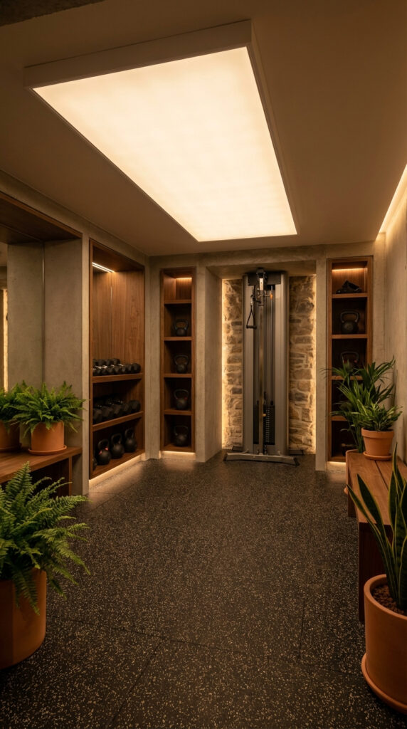 A circular ceiling skylight simulation introduces soft overhead illumination, visually opening the room and reducing the feeling of being underground. The addition of a living green plant installation brings natural texture and color into the space, improving the overall atmosphere and creating a connection to nature even within a protected environment.