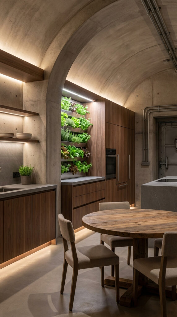 This kitchen combines food preparation, storage, and cultivation into one cohesive space — designed for practicality, comfort, and everyday living in a carefully engineered underground home.