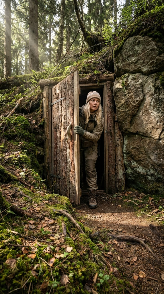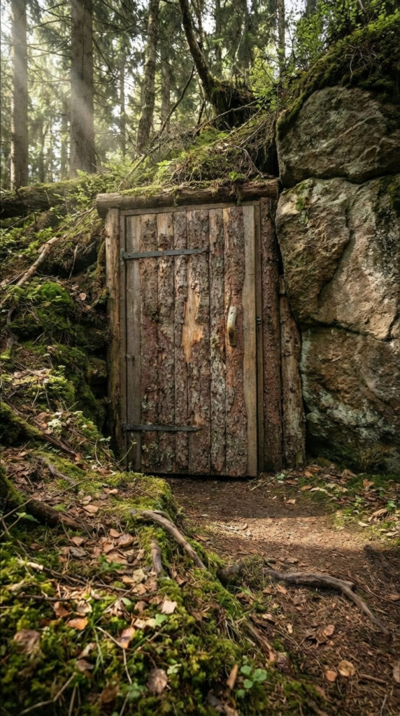 Hidden deep within a natural rock formation, this underground bunker is designed to blend seamlessly into the surrounding forest while providing a secure and comfortable living environment below ground. The entrance remains almost invisible from the outside — a simple wooden door integrated into stone and moss, allowing the structure to remain naturally concealed within the landscape.