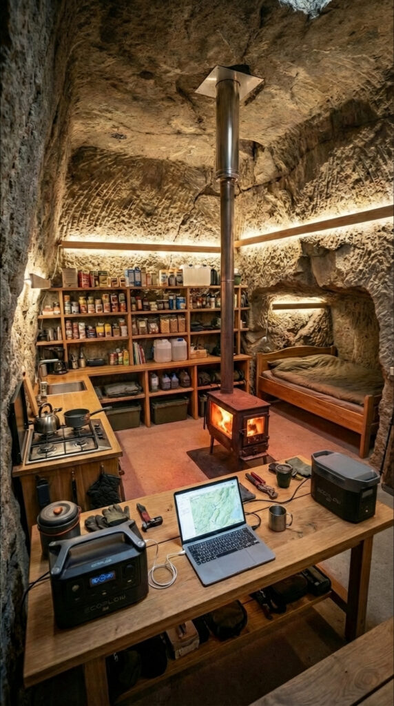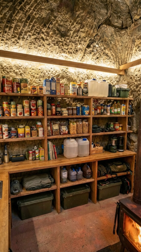 This supply system demonstrates how thoughtful organization transforms a small underground shelter into a dependable living space, where food, water, and essential gear remain ready for everyday use without sacrificing comfort or efficiency.