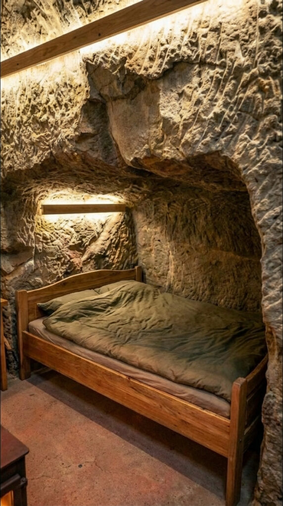 This sleeping area demonstrates how a shelter built directly into rock can remain both practical and inviting, combining natural protection with thoughtful interior design to create a quiet and dependable place to recharge.