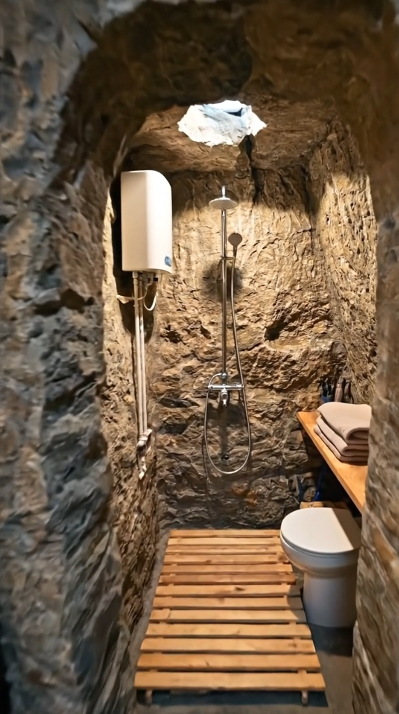 Despite its minimal footprint, the bathroom supports everyday hygiene needs, making long stays inside the bunker practical and comfortable. The combination of natural materials, efficient layout, and simple engineering demonstrates how even a carved rock shelter can include a fully usable and thoughtfully designed sanitary area.