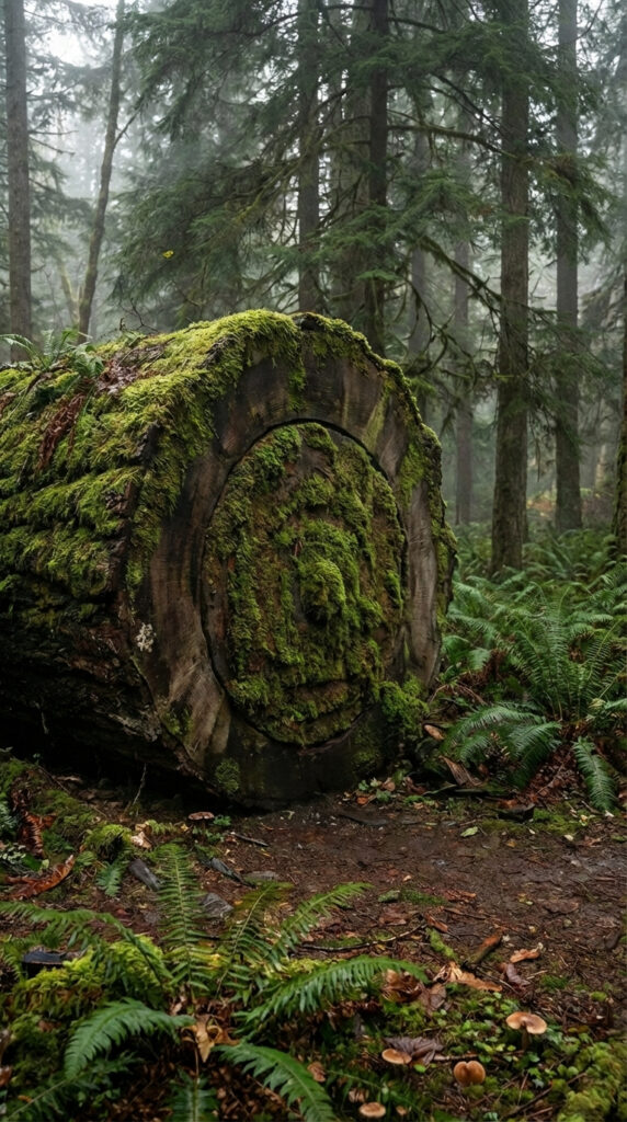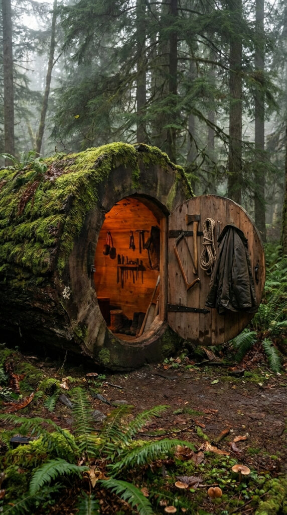 Deep within a misty evergreen forest, this hidden log shelter blends seamlessly into nature, transforming a fallen tree into a discreet and functional living space. From the outside, the structure appears like an ordinary moss-covered trunk, naturally aging with the surrounding environment and remaining nearly invisible to passersby. A circular wooden entrance reveals a warm handcrafted interior designed for practicality and comfort. Inside, wooden walls create a cozy atmosphere while essential tools and supplies are neatly organized for everyday use and long stays in the wilderness.