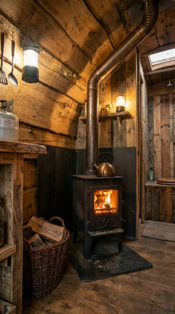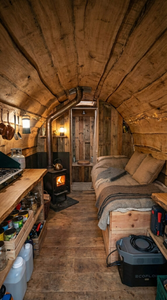 Stepping inside the hollow log reveals a surprisingly comfortable and carefully organized living space shaped by the natural curves of the tree itself. The wooden interior creates a warm and calming atmosphere, enhanced by soft ambient lighting and the gentle glow of a compact wood stove that provides both heat and a cozy focal point. A practical kitchenette runs along one side, equipped with a gas burner, cooking tools, and neatly stored supplies, allowing simple meals to be prepared even during long stays in the forest.