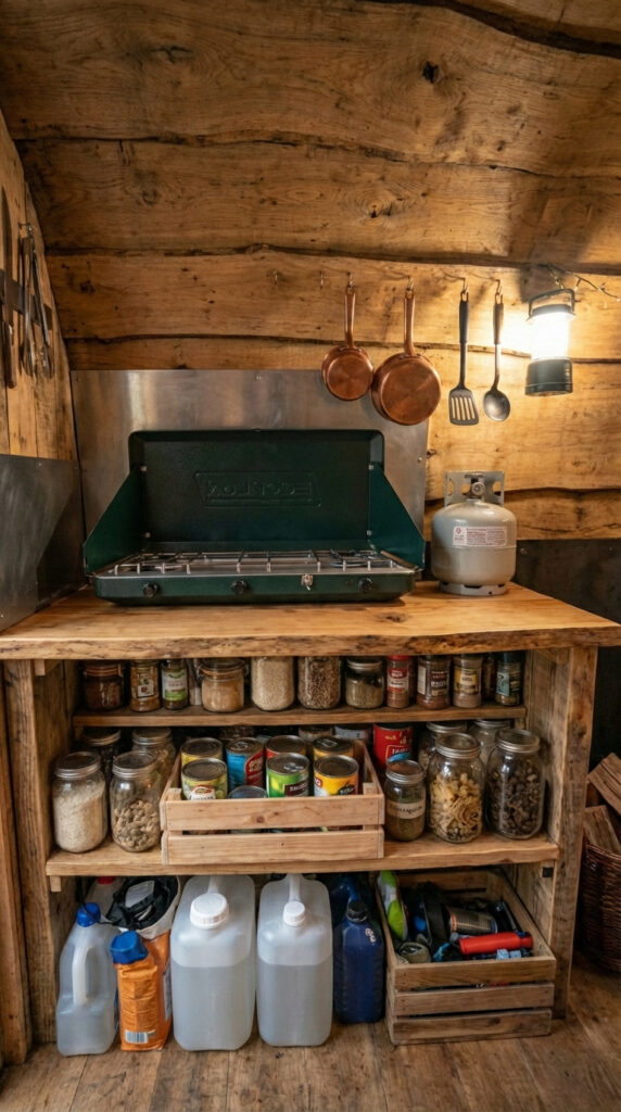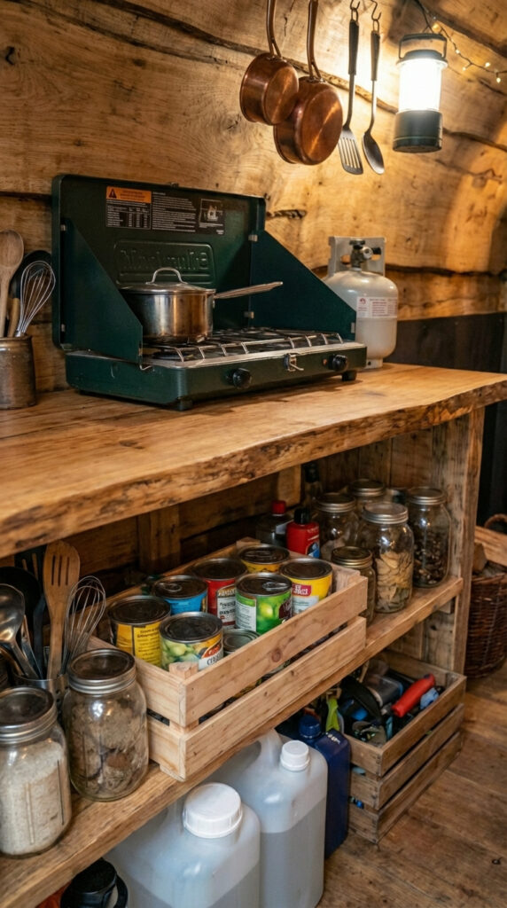 Open wooden shelving below the counter stores preserved foods, dry ingredients, and cooking supplies in an organized and accessible way. Glass jars and sealed containers help protect food from moisture while allowing quick visual access to supplies. Water containers are positioned underneath for convenient storage and easy refilling, supporting longer stays without frequent trips outside. The layout emphasizes simplicity and reliability, ensuring that everything needed for daily living is available within arm’s reach.
