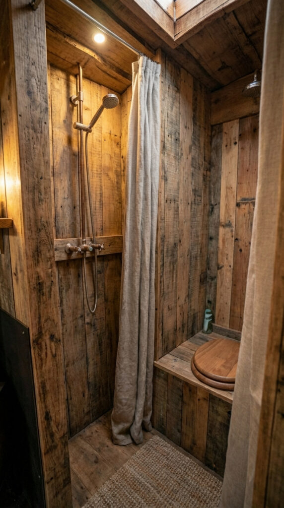 The shower system offers a practical solution for maintaining hygiene during extended stays in the forest. A simple curtain provides privacy while protecting the surrounding wooden surfaces from moisture. Carefully positioned lighting creates a warm and relaxing atmosphere, transforming the space into more than just a functional utility area. Natural wood textures combined with soft illumination give the bathroom a calm, cabin-like feeling rather than a traditional enclosed washroom.