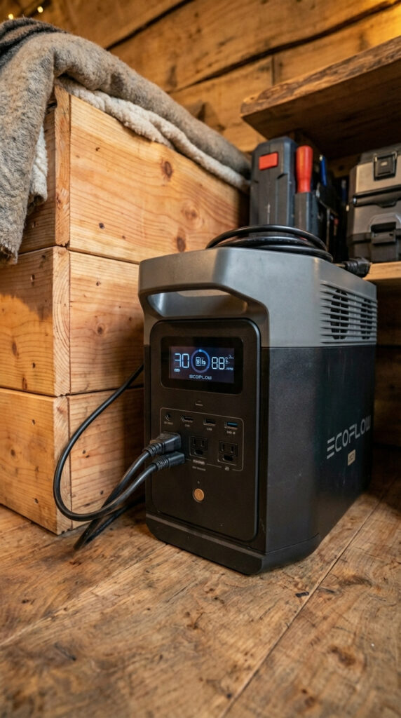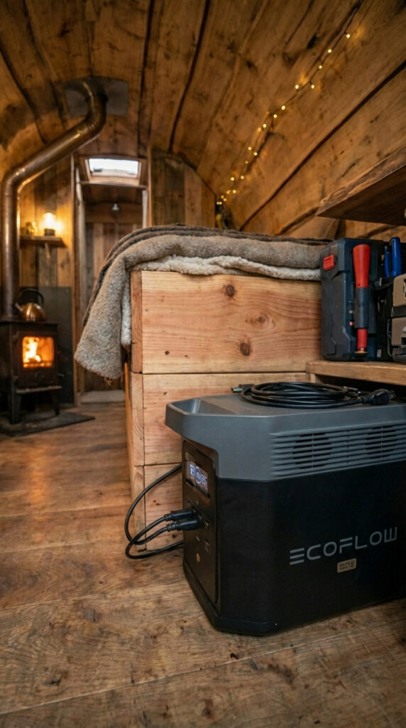 The portable design makes energy management simple and flexible. The power station can be recharged using external energy sources when needed, ensuring continuous operation during extended stays. Its silent performance preserves the calm atmosphere of the shelter, unlike traditional generators that introduce noise and fumes. Carefully placed near the sleeping area, the unit allows easy access to charging ports while remaining safely positioned within the compact layout.