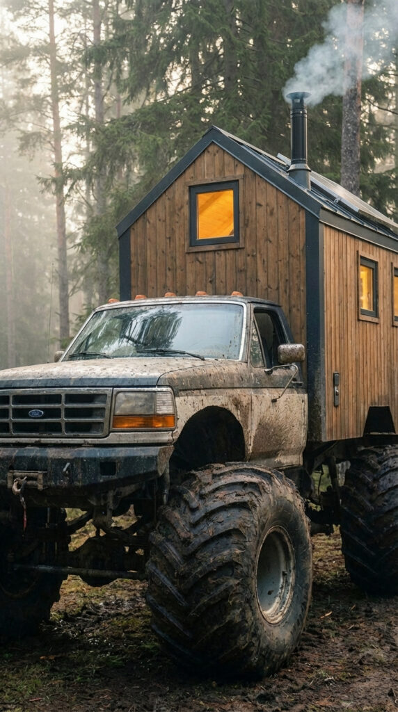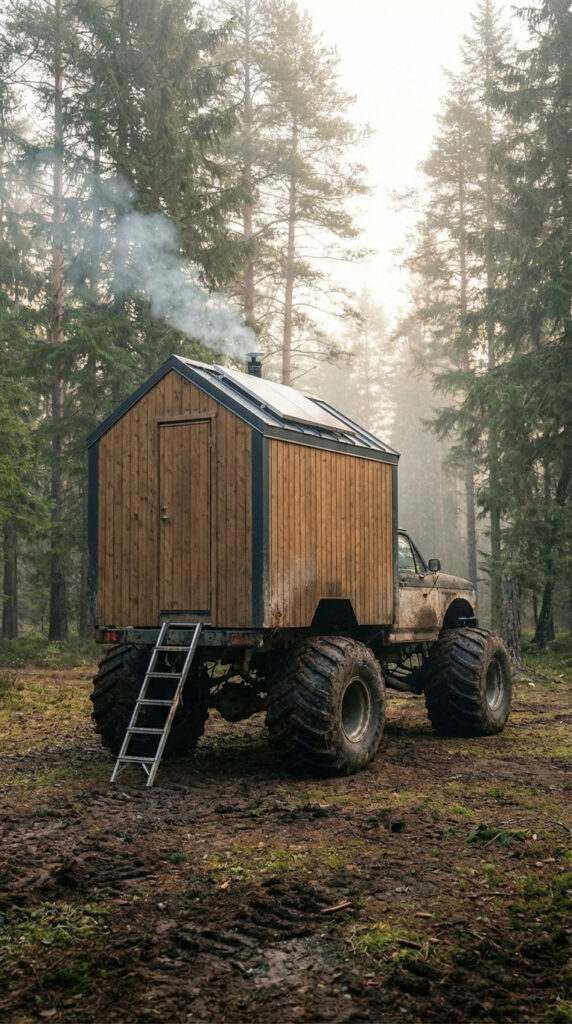 Built for places where roads end and true wilderness begins, this monster-truck cabin transforms a powerful off-road vehicle into a fully functional mobile home designed for extreme exploration and self-reliant living. Mounted on oversized all-terrain tires and a reinforced chassis, the compact wooden cabin allows its owner to travel deep into forests, mountains, and remote landscapes that traditional campers could never reach.