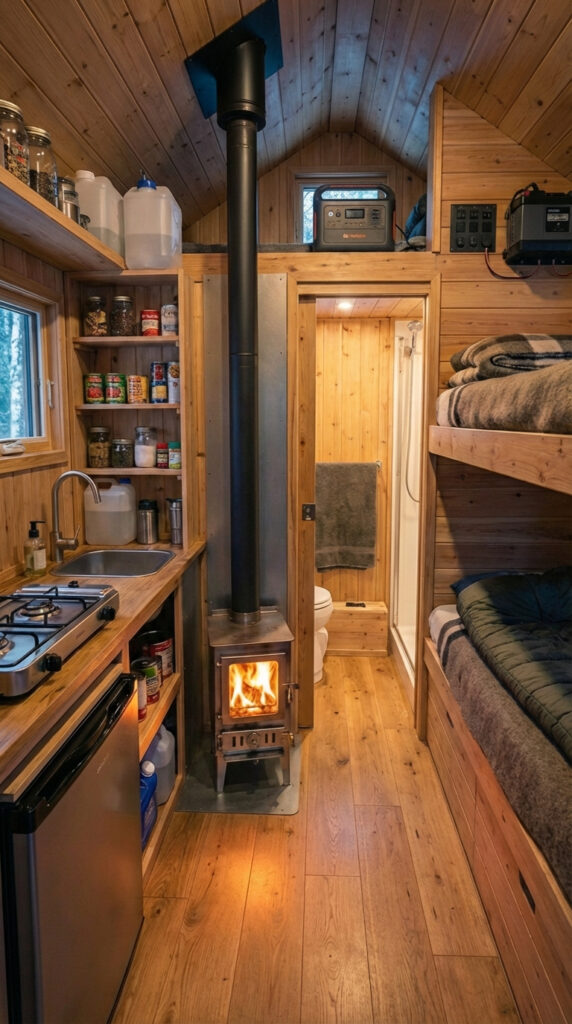 The cabin’s kitchen area is designed to deliver everything needed for daily cooking while maintaining a clean, efficient layout suited for off-grid living. Despite the limited interior size, the kitchenette feels practical and surprisingly complete, allowing residents to prepare hot meals comfortably even in remote locations.