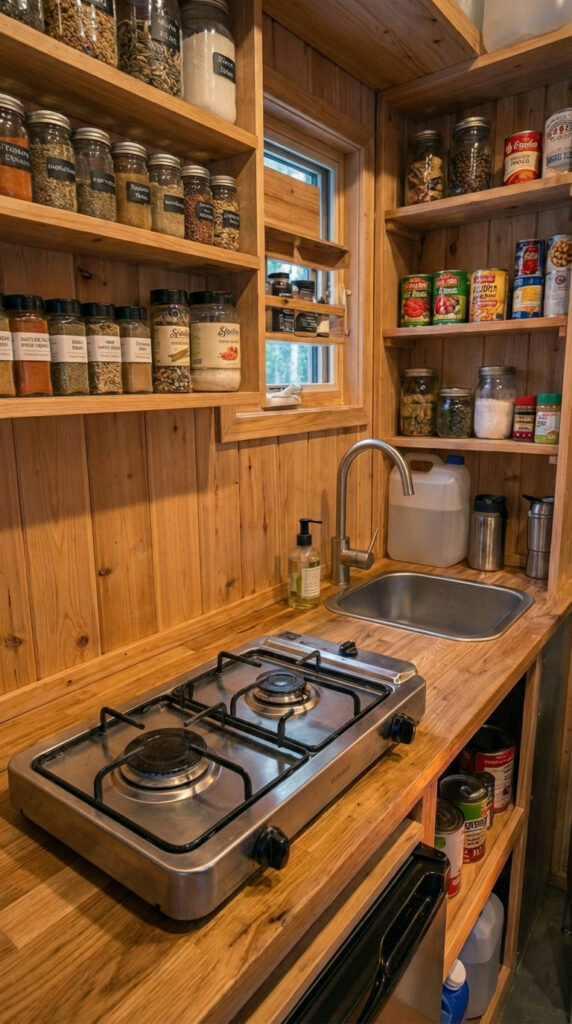 Open wooden shelves surrounding the kitchen maximize vertical storage space. Glass jars with grains, spices, and preserved foods create both a visually warm atmosphere and a highly functional pantry system, ensuring quick access to supplies while traveling.