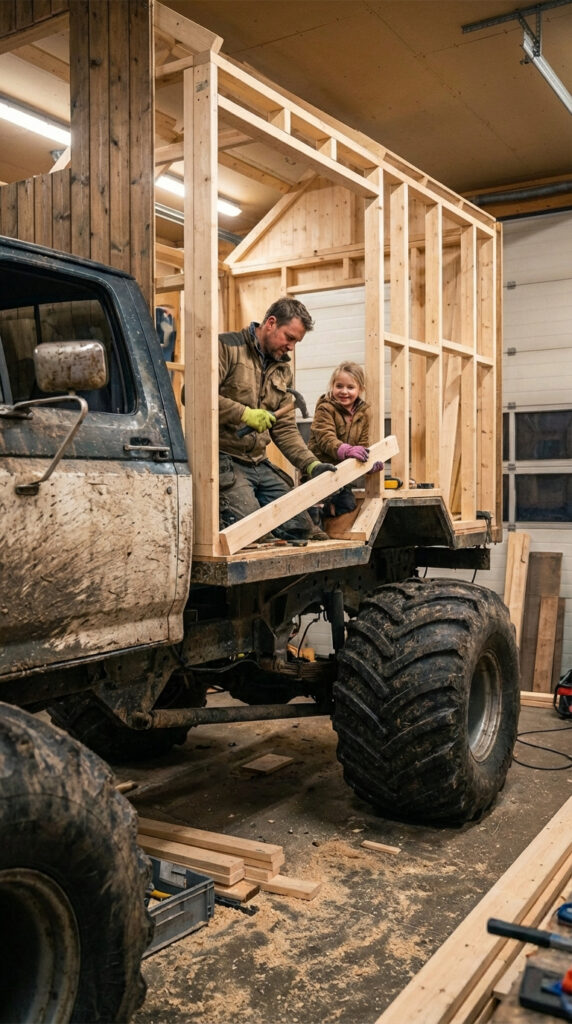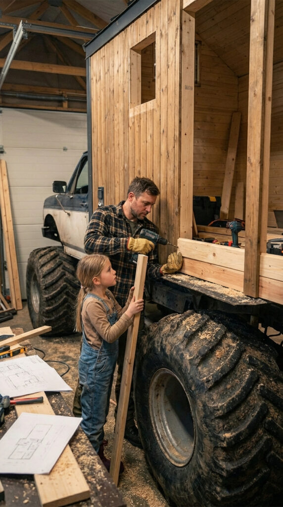 The project started with an old heavy-duty truck platform. The father handled the structural planning and reinforcement of the chassis, ensuring the vehicle could safely carry the weight of a wooden cabin across rough terrain. Meanwhile, his daughter helped design the interior layout, focusing on comfort and practicality — where the beds would fit, how storage could be hidden, and how to keep the space warm and livable during cold nights.