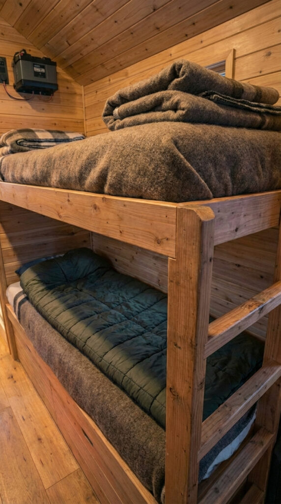 The lower bunk serves as the main resting area, positioned at an accessible height and fitted with a thick insulated mattress designed for cold-weather environments. Natural wool blankets and layered bedding help retain warmth during winter nights, while the surrounding wooden walls create a cozy, protected atmosphere similar to a traditional alpine shelter.
