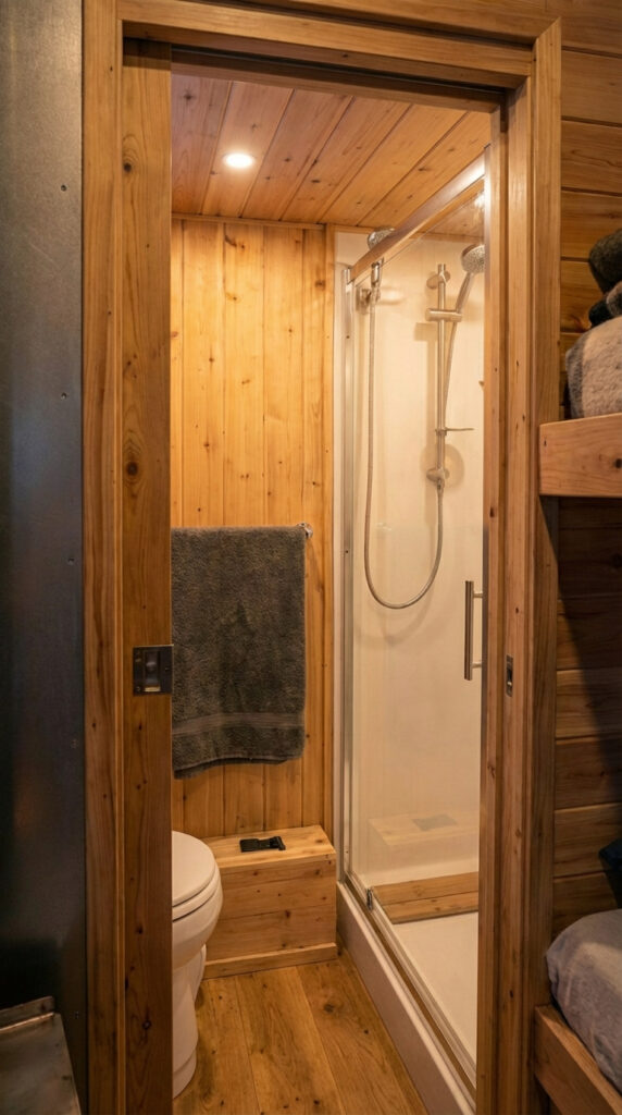 Next to the shower, a compact toilet unit is neatly integrated into the layout, positioned to maximize movement space without crowding the room. The surrounding wooden walls create a warm, cabin-like atmosphere, transforming what could feel like a tight utility area into a cozy and inviting part of the home.