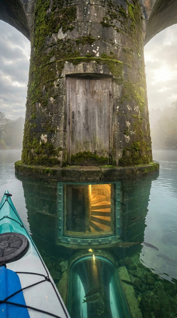 Built inside a massive stone bridge column, this hidden underwater bunker combines engineering ingenuity with survival-focused design. The discreet wooden door blends naturally into the aged structure, concealing an entrance that leads to a spiral staircase descending through the column itself. As the stairs move below the waterline, the space transforms into a fully sealed concrete bunker resting safely beneath the river.