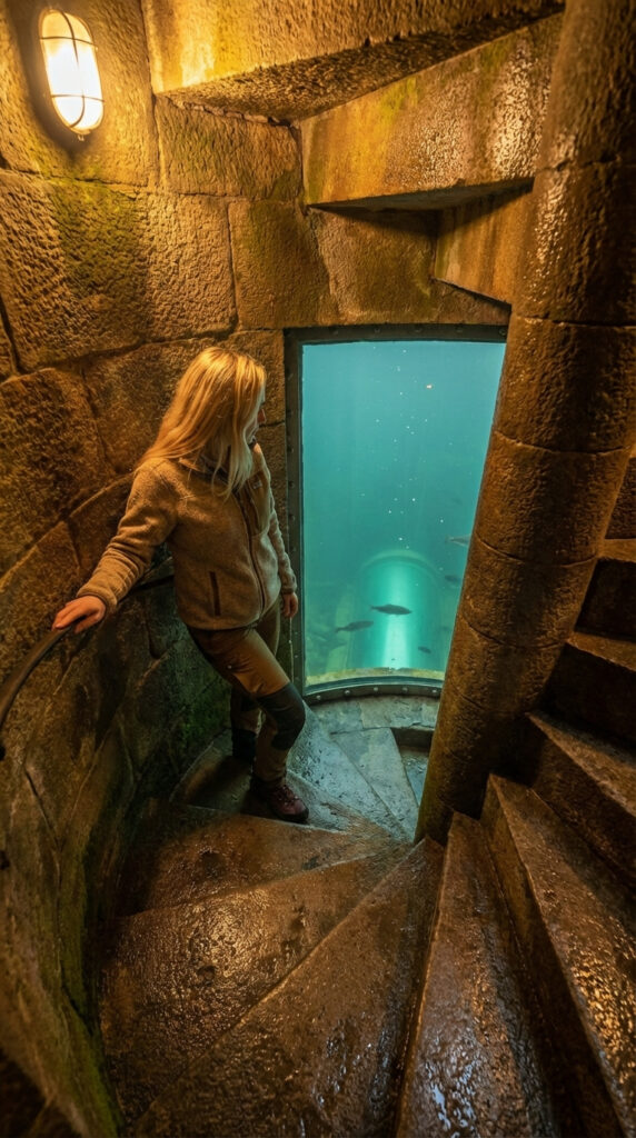 As the descent continues, a reinforced underwater viewing window appears along the staircase, offering the first glimpse beneath the river. Fish move quietly past the thick armored glass while natural light filters through the water, transforming the passage into a calm and immersive experience. This gradual descent not only serves as access to the bunker but also acts as a psychological transition — leaving the surface behind and entering a hidden, protected environment designed for safety and isolation.
