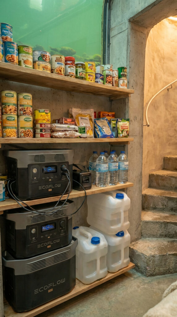Along one wall, organized storage shelves hold carefully arranged food supplies, canned meals, dry goods, and essential provisions intended for extended stays. Large water containers provide a reliable reserve for drinking, cooking, and hygiene, ensuring full independence from external resources. Nearby, EcoFlow power stations supply silent electricity for lighting, ventilation, and everyday devices, allowing the shelter to function as a fully autonomous living environment.