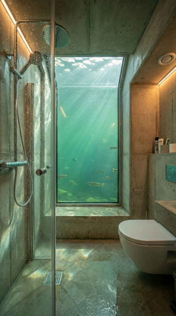 The highlight of the space is the reinforced panoramic underwater window positioned directly beside the shower and toilet area. Natural light filters through the water above, creating moving reflections across the walls while fish slowly pass by outside, turning a simple daily routine into an immersive underwater experience. The armored glass is engineered to withstand constant water pressure while maintaining thermal insulation and structural safety.
