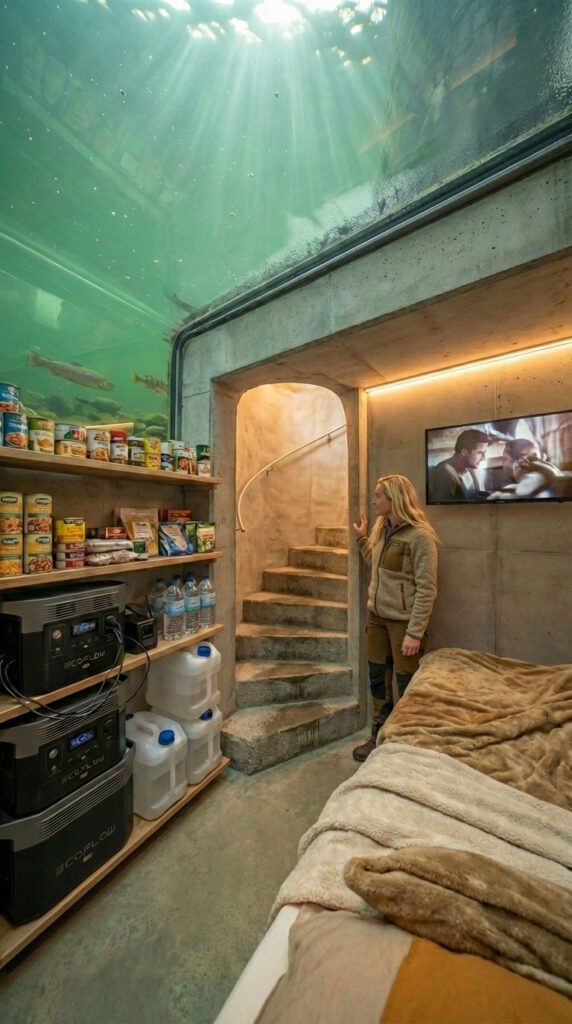 The sleeping area is integrated directly into the space, transforming the bunker from a survival structure into a true residential zone. Warm textiles, soft lighting, and practical layout choices create a balance between security and comfort, making the underwater bunker feel less like a refuge and more like a hidden home beneath the river.