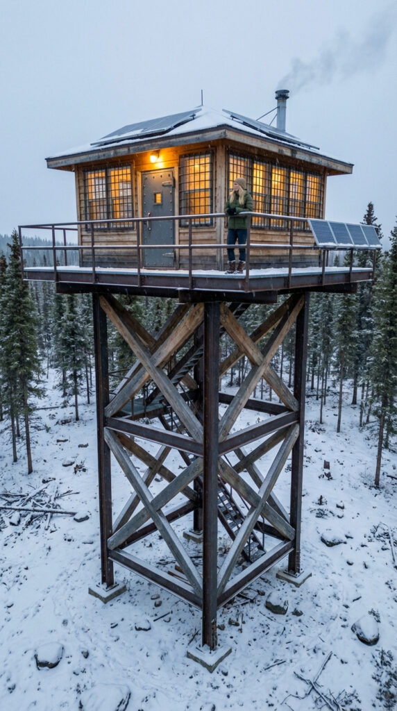 Designed for year-round living, the cabin combines durability with comfort. Thick insulated walls, a solid metal entry door, and a reliable heating system maintain warmth even in freezing conditions. Solar panels mounted along the platform provide consistent energy support for lighting and essential appliances, while the elevated position improves airflow and visibility across the terrain. More than just a lookout, this tower home represents a modern interpretation of wilderness living — safe, efficient, and deeply connected to nature, offering privacy, security, and an unforgettable perspective above the trees.