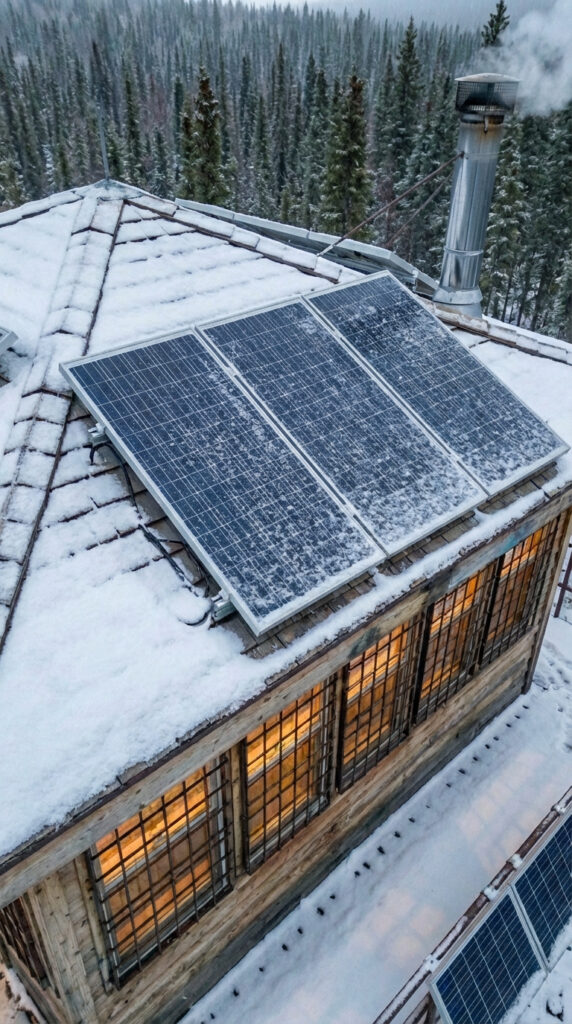Mounted securely on the roof, the solar panel system provides reliable energy for lighting and essential electrical needs inside the elevated forest cabin. Positioned at an optimal angle to capture available daylight, the panels efficiently convert sunlight into electricity even during cold winter conditions. Snow naturally slides off the smooth glass surface, helping maintain performance throughout the season.