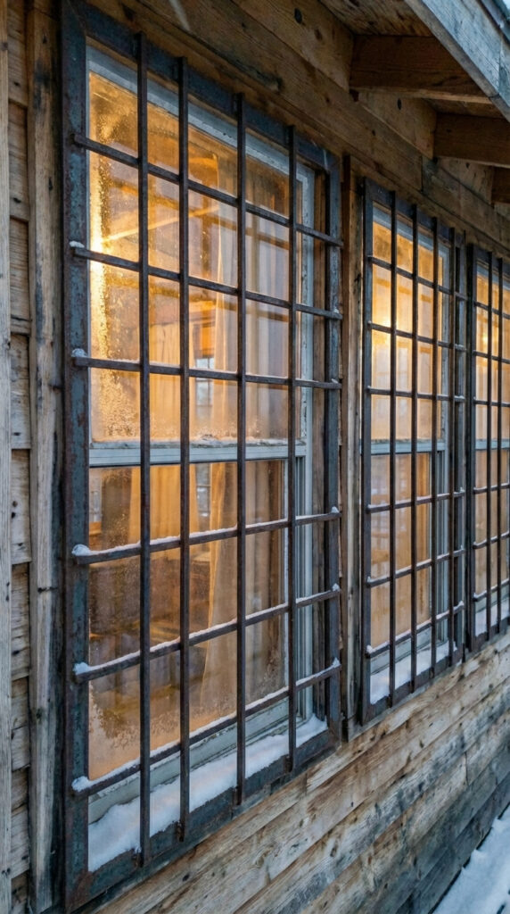 Together, the armored windows, protective grilles, and reinforced door transform the elevated cabin into a safe and resilient shelter, combining practical security with modern architectural aesthetics suitable for remote forest living.