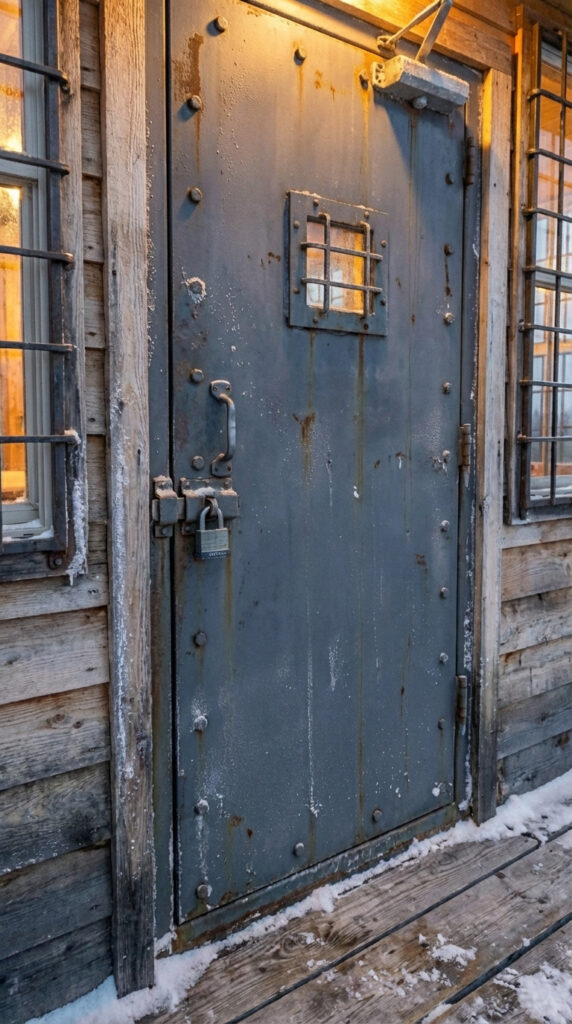 The solid steel entrance door adds an additional layer of protection, built with reinforced hinges and a multi-point locking system for enhanced reliability. This construction helps secure the interior space while maintaining insulation and structural stability during heavy winds or snowfall. Despite the protective design, the large window surfaces continue to allow warm interior light to fill the cabin, preserving a comfortable and welcoming atmosphere.