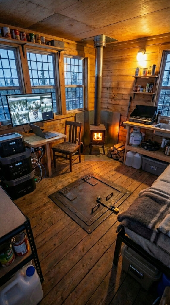 Energy storage units power lighting and electronics, supporting daily living needs efficiently. The reinforced floor hatch adds an extra layer of security and functionality, providing access to storage or a protected lower level. Every element inside the cabin is carefully arranged to balance safety, comfort, and self-sufficient living, creating a secure and inviting refuge high above the forest.