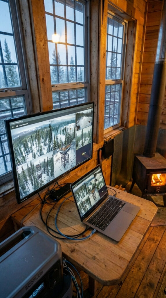 Live video feeds are displayed on a dedicated monitor and laptop workstation, enabling continuous observation without leaving the safety and warmth of the interior. The system helps track weather changes, wildlife movement, and any approaching visitors, improving overall situational awareness in a remote location. High-resolution cameras maintain clear image quality even in low-light or snowy conditions, ensuring reliable monitoring throughout the day and night.
