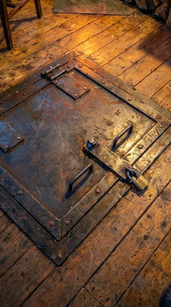 In addition to security, the hatch serves a practical function by allowing controlled access to the lower level or protected storage area beneath the cabin. Combining strength, functionality, and simple mechanical reliability, the steel hatch enhances both safety and usability while fitting naturally into the rugged design of the elevated forest shelter.