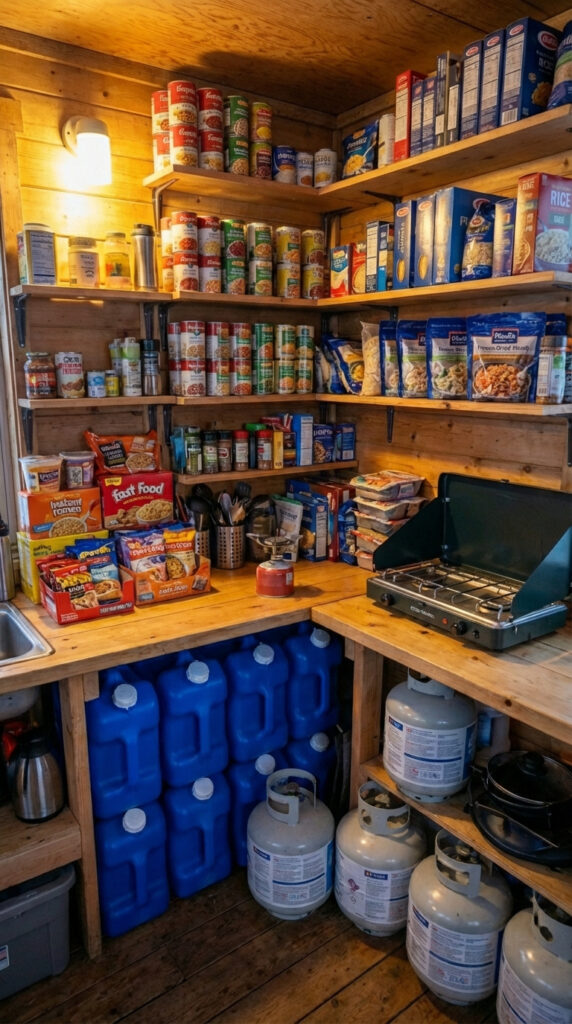 The cabin includes a carefully organized supply zone designed to support comfortable living for an extended period. Shelving units are stocked with a wide variety of long-lasting food products such as canned meals, dry grains, pasta, rice, instant foods, and preserved ingredients that remain usable for weeks without refrigeration. Clear organization allows quick access to essential items while maximizing the limited interior space.