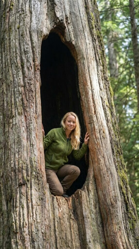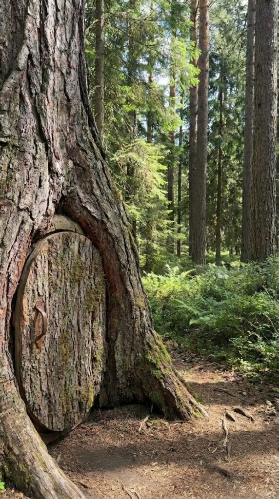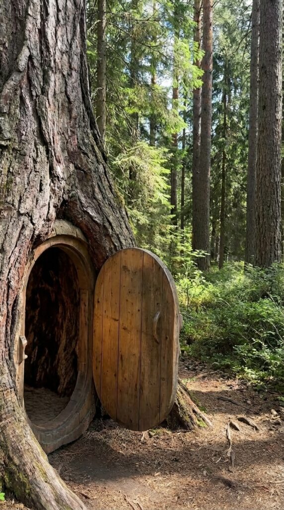 Thick natural wood walls provide insulation from temperature changes and outside noise, creating a calm and quiet atmosphere inside. The circular doorway reinforces structural strength while enhancing the rustic aesthetic, making the shelter appear like a natural extension of the tree itself. Ideal as a discreet retreat, survival hideout, or creative escape, this tree-integrated refuge demonstrates how architecture can merge with living landscapes, transforming a simple forest environment into a hidden sanctuary that feels timeless, protected, and deeply connected to nature.