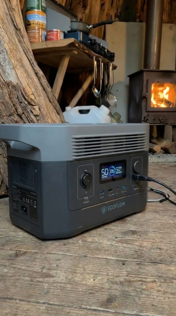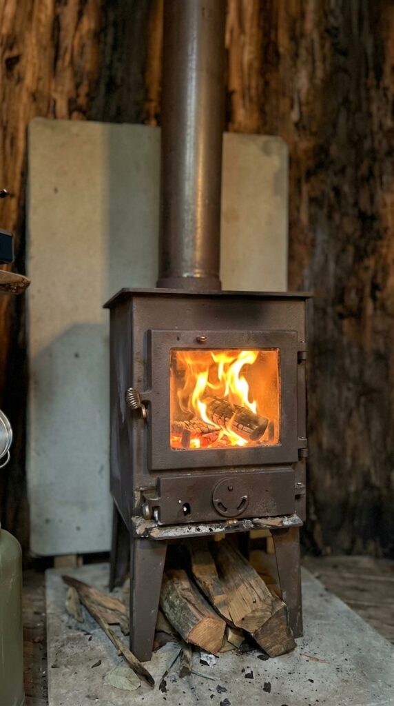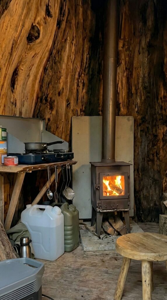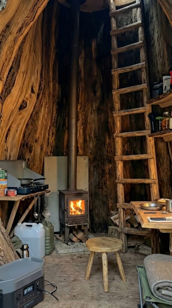 The interior of the tree shelter combines traditional heating with modern portable energy solutions, creating a balanced and highly functional living environment inside a natural structure. A compact wood-burning stove serves as the primary heat source, providing steady warmth while its visible flame adds a comforting atmosphere during cold forest nights. Positioned on a protected base with heat shields behind it, the stove ensures safe operation while efficiently warming the entire interior space. Nearby, a portable power station supplies electricity for lighting, charging devices, and small equipment, bringing modern convenience into an otherwise rustic setting.