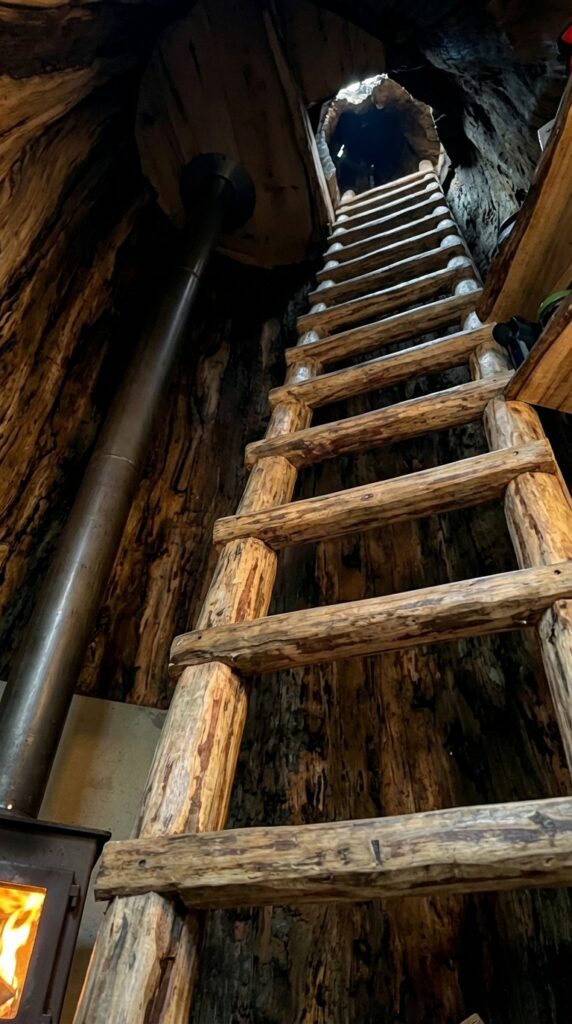 Inside the massive tree shelter, a handcrafted wooden ladder provides vertical access to an elevated upper level located approximately seven meters above the ground. Built from natural timber, the ladder follows the inner contours of the hollow trunk, allowing safe and efficient movement between levels while preserving the organic character of the space. The vertical design maximizes the natural height of the tree, transforming the interior into a multi-level refuge rather than a single compact room.