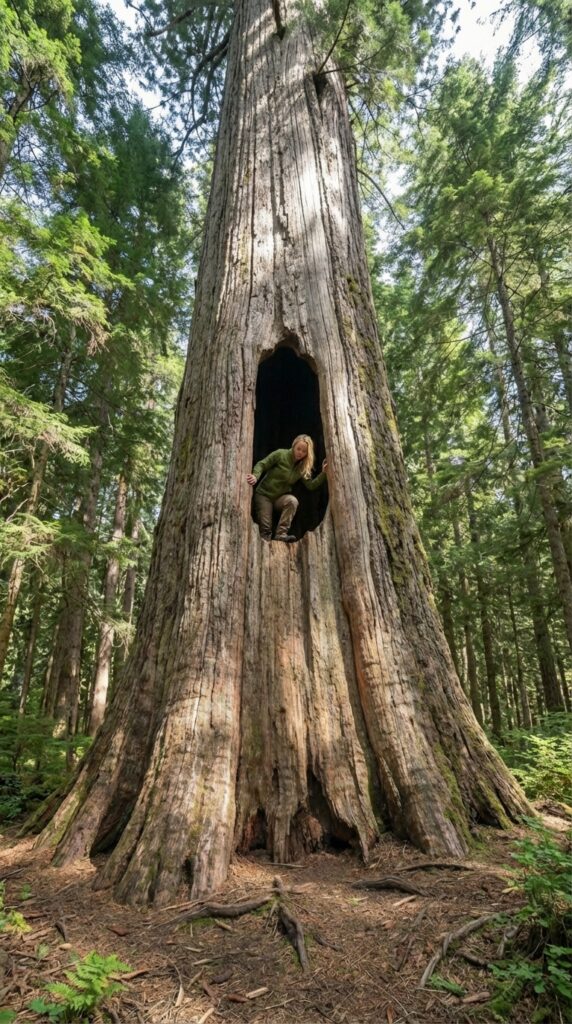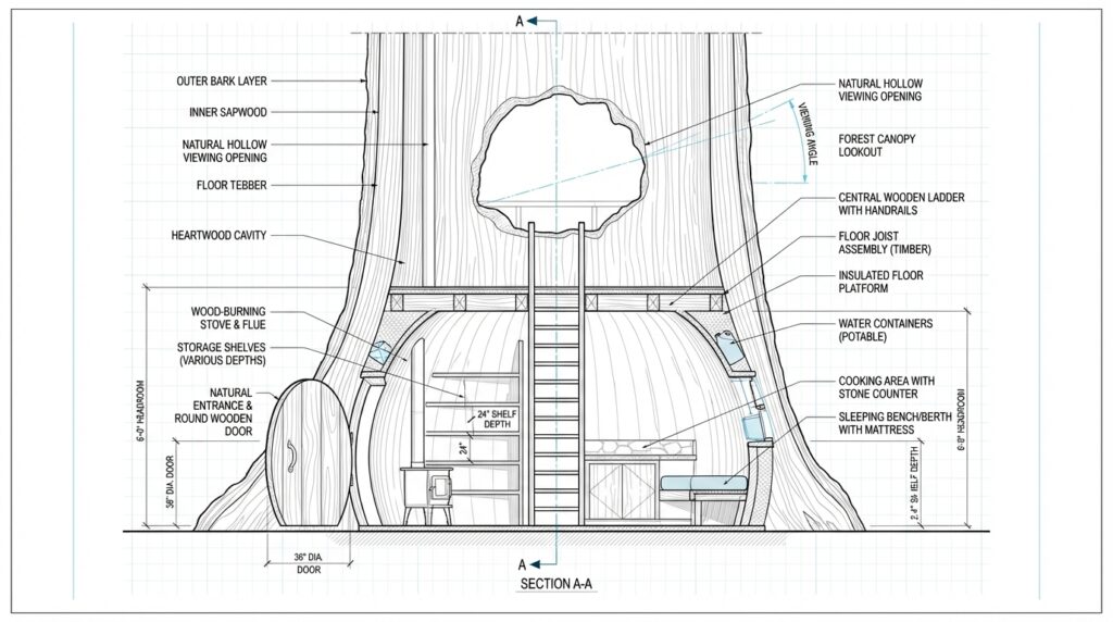 As the ladder rises, warm light from the stove below contrasts with the natural daylight entering through the upper opening. At the top, the structure reveals a hidden viewing point carved into the trunk, offering a unique perspective overlooking the surrounding forest canopy. From this elevated opening, the landscape becomes visible through the natural hollow, creating a quiet observation spot immersed in nature. The height provides both privacy and a sense of security while enhancing airflow and natural illumination inside the shelter. This vertical layout demonstrates how natural tree architecture can be adapted into functional living design, combining practicality, exploration, and a breathtaking forest viewpoint within a single hidden woodland home.