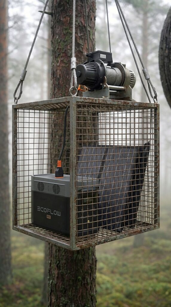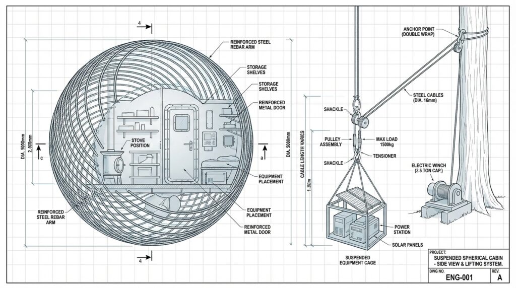 The suspended forest capsule is supported by a carefully engineered cable lift system designed to provide controlled movement, stability, and reliable access above ground level. At the heart of the mechanism is an electric winch mounted inside a reinforced steel cage, protecting critical equipment from weather exposure and external damage. High-tension steel cables connect the lifting system directly to the cabin, allowing smooth vertical positioning and precise height adjustment when needed. The lifting platform also houses a portable power station and foldable solar panels, ensuring consistent energy supply for operating the winch and maintaining essential onboard systems.