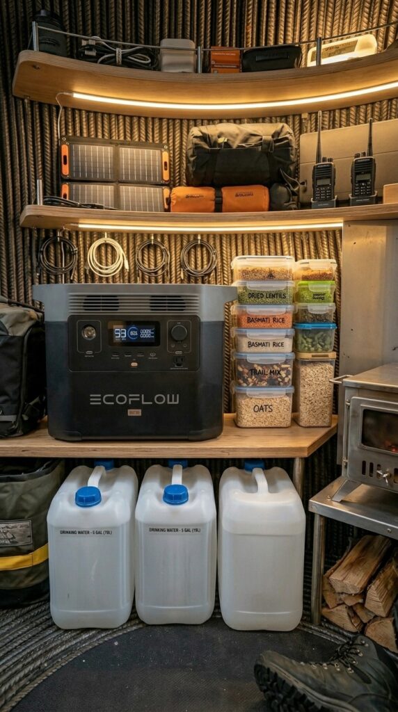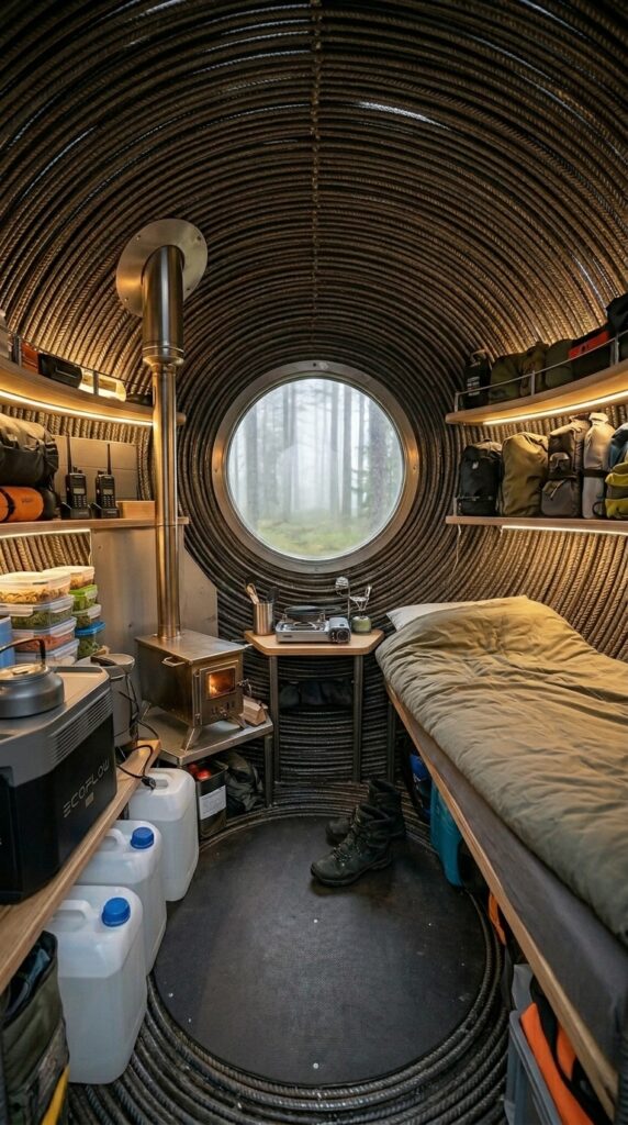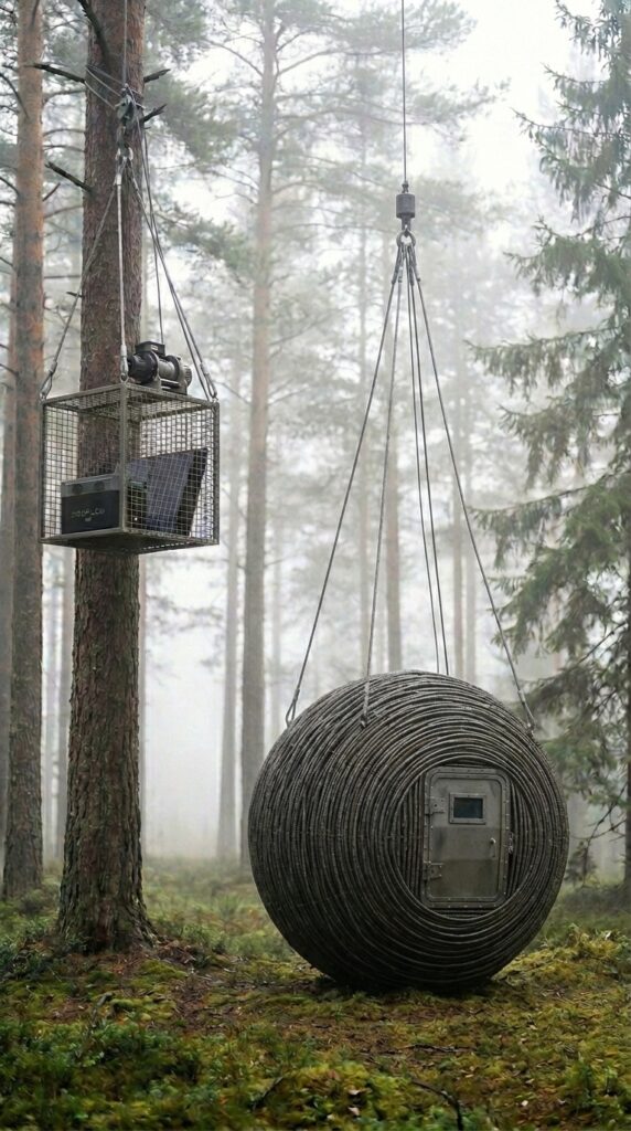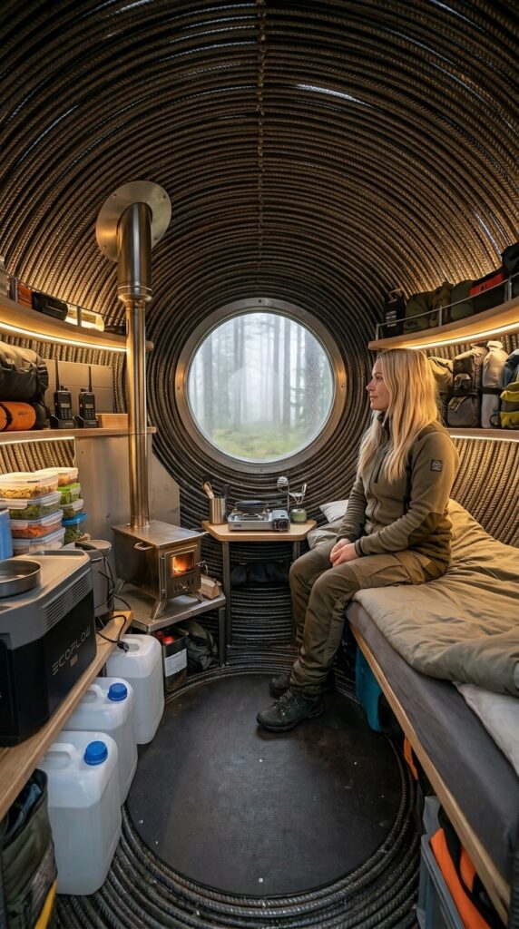 Inside the reinforced steel capsule, the interior space is carefully organized to provide comfort, warmth, and practical functionality within a compact environment. A small wood-burning stove serves as the central heating element, efficiently warming the curved interior while creating a cozy atmosphere during cold forest conditions. The rounded structure helps distribute heat evenly, allowing the space to remain comfortable with minimal fuel consumption. Along one side, a portable power station paired with solar charging equipment provides reliable electricity for lighting, communication devices, and essential appliances. Storage shelves are thoughtfully arranged to maximize every centimeter of space, holding food supplies, water containers, and survival essentials prepared for extended stays. Large water canisters ensure a stable reserve, while neatly packed provisions allow long-term living without frequent resupply. Soft interior lighting, natural wood accents, and practical sleeping arrangements transform the industrial steel shell into a warm and livable retreat. The layout balances efficiency and comfort, demonstrating how a small suspended structure can function as a fully equipped forest shelter designed for resilience, practicality, and everyday usability in remote natural surroundings.